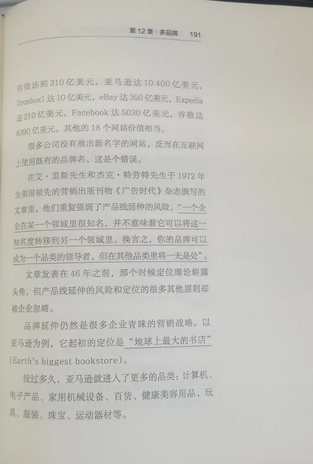 品牌延伸仍然是很多企业青睐的营销战略。以亚马逊为例,它起初的定位是“地球上最大的书店’(Earth's biggest bookstore)。没过多久,亚马逊就进入了更多的品类:计算机电子产品、家用机械设备、百货、健康美容用品、玩具、服装、珠宝、运动器材等。